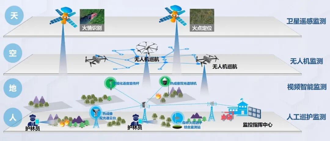 构建“天空地人”立体化监测网络,对火险因子、火情要素进行立体化、全方位监测,实现监测对象广泛覆盖、监测手段多样融合、监测数据高效采集。